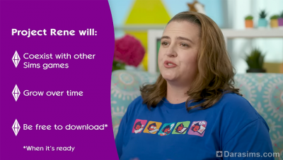 Линдси Пирсон, ответственная за всю франшизу, заверила, что основной их принцип — оставить в игре то, что делает симов симами, и добавить при этом то, что раньше не получалось реализовать. Самое важное в ее речи было то, что Симс 4 и Симс 5 будут существовать параллельно и контент для четверки продолжит выходить, а Проект Рене будет бесплатным для скачивания. Платными будут допы. При этом принцип их добавления несколько изменится. Базовые для каждой новинки функции будут доступны всем, например, погода, а вот специфические возможности, типа сезонных видов спорта или соревнований по лепке снеговиков уже будут за деньги.