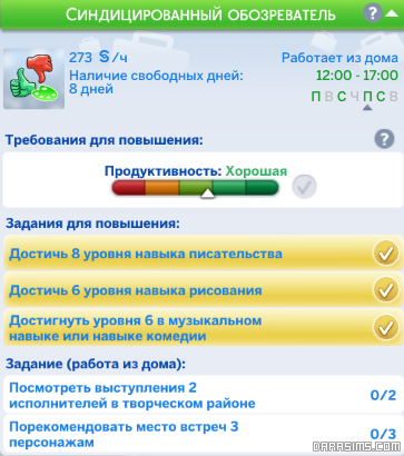 Обратите внимание, что при трудоустройстве, вашему симу автоматически будет предложено ежедневное задание «Упражняться в писательстве». Принимать его не обязательно, но оно может немного повысить продуктивность вашего сима и подготовить его к следующему рабочему дню.